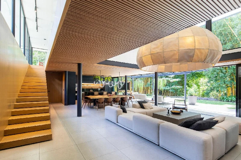 В гостиной двойной высоты доминирует пергаментная люстра диаметром 3,5 метра, выполненная по индивидуальному проекту. Она характеризует внутреннюю гостиную. Открытая гостиная защищена глубокой стеклянной крышей, которую подчеркивают большие подвесные телевизионные экраны.